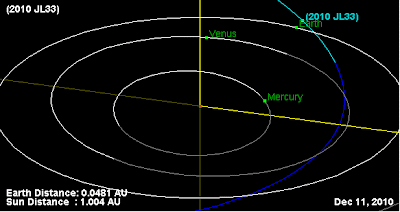 : This area will cover relevant news of the threat to the planet from Near Earth Objects NEOs including concepts and designs for mitigation . Time for site updates is donated by SpaceWorks Commercial in Washington , D.C . USA to the author . All opinions are those of the . author 12 January 2011 Goldstone Radar Results for Asteroid 2010 JL33 Preliminary Orbit of Asteroid 2010 JL33 on December 11, 2010 Source : JPL Small-Body Database Browser Orbit Diagram New radar imagery for Asteroid 2010 JL33 From the video : While safely passing Earth , NASA's Goldstone Solar System Radar captured the rotation of asteroid JL33 an irregular , elongated object roughly 1.8 kilometers 1.1 miles wide . The video consists of . 36-frames Link : YouTube Video NASA Radar Reveals Features on Asteroid Link : JPL