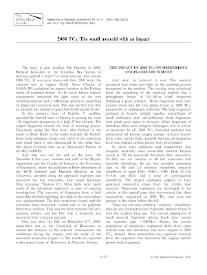 : : This area will cover relevant news of the threat to the planet from Near Earth Objects NEOs including concepts and designs for mitigation . Time for site updates is donated by SpaceWorks Commercial in Washington , D.C . USA to the author . All opinions are those of the . author 04 January 2011 Meteoritics Planetary Science : October November 2010 Multiple Articles on Asteroid 2008 TC3 and Output Science Results The October November 2010 Volume 45, Issue 10-11, Pages 1553–1845 issue of the journal Meteoritics Planetary Science has multiple articles on the recovered asteroid 2008 TC3 A NASA Goddard press release a contains more information on the implications of some of the science results , specifically on finding amino acids in samples of the 2008 TC3 . asteroid A summary of the