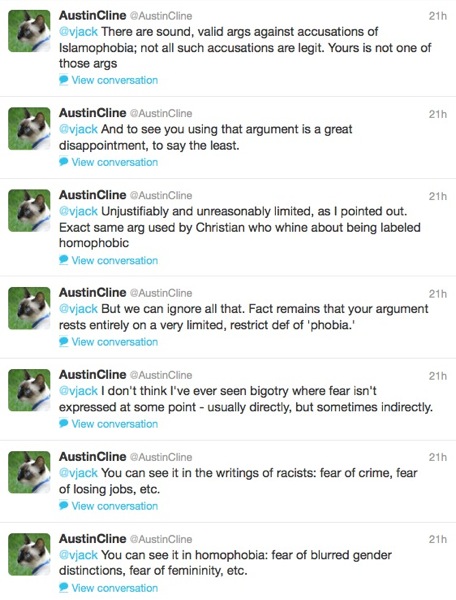 Atheist Revolution Breaking free from irrational belief and opposing Christian extremism in . America Pages About Disclosure Privacy Advertising Contact September 23, 2012 Post on Islamophobia Elicits Strong Reaction I wrote a post yesterday on the subject of Islamophobia In it , I said that I found it to be a nonsensical term because I do not see any connection between phobias and what people mean by this term . I wrote that the term reflects negative attitudes toward Islam and or Muslims , and I suggested that we be more precise in our terminology . That is , if we are trying to convey anti-Islam sentiment or hatred of Muslims , we say so . I might call myself an anti-theist , but it would not occur to me to call myself a theistophobe . I noted that I have a similar reaction when I hear