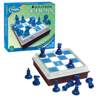 : skip to main skip to sidebar Brian's Damn Puzzle Blog A chronicle of my descent into the realm of the . puzzle-obsessed December 21, 2010 Solitaire Chess This year , ThinkFun launched a new puzzle called Solitaire Chess designed by Vesa Timonen . Tanya Thompson was kind enough to send me a copy for helping them test out another puzzle they are working on . Thanks Tanya The idea of Solitaire Chess is to set up the pieces as shown one of the challenge cards and , by capturing pieces with every move , end up with only a single piece remaining on the board . In this way , it is similar to the peg-solitaire game that became so widely known . The standard movements of the chess pieces apply . However , there are no black and white pieces , only blue , so there are no alternating turns like in