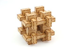 : skip to main skip to sidebar Brian's Damn Puzzle Blog A chronicle of my descent into the realm of the . puzzle-obsessed August 23, 2012 2012 Puzzle Design Competition Part 3 This is the third part of my series of posts about the puzzles in the 2012 Design Competition that did not win an award . All of the photos are by Nick Baxter from the 2012 Puzzle Design Competition website COG-Cubed Tom Longtin I wasn't quite sure what to expect with this puzzle , it looks like a burr , but it has a pretty unusual construction . Rather than cutting the pieces out of solid wood , the faces were laser cut and then glued together , so the pieces are quite large and hollow . The goal is to take it apart and put it back together . again I tried taking it apart and didn't have much difficulty , the chunky