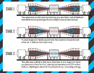 skip to main skip to sidebar Pages Home Timeslide View Flipcard June 27, 2011 Helion Energy and General Fusion in the mainstream media Popular Mechanics featured Helion Energy Field reversed configuration fusion with colliding plasmoids General Fusion gets covered by CNN General fusion is working on a precision controlled piston that hammers giant shock waves into a magnetized sphere slamming atoms together hard enough to fuse and create energy . The idea triggered investments in Laberge's young company , first from family and friends , then from venture capitalists including Amazon.com founder Jeff Bezos . So far , funding has totaled 32.5 million . If you liked this article , please give it a quick review on ycombinator or StumbleUpon Thanks Posted by bw at 6 27 2011 Labels : fusion