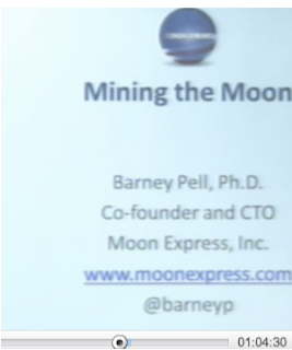 skip to main skip to sidebar Pages Home Timeslide View Flipcard June 27, 2011 Moon Express talk by Barney Pell Moon Express , Inc . MoonEx is targeting mining the . moon Major Moon Markets Mining for Space and Terrestrial Markets Generating space-based solar power space-based manufacturing , research and development space tourism and entertainment Mining the moon water . at least 1 billion tons in the poles precious metals platinum , other platinum grade metals Lithium , gallium Helium-3 Silicon 28 400 higher heat dissipation , although silicon 28 is 92 of the earth silicon , so maybe the wrong isotope number Industrial metals aluminum cheaper than bringing from the earth for space based industry Four disruptive technologies lead to successful moon mining 1. Commercial launchers 2.