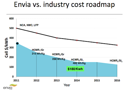 skip to main skip to sidebar Pages Home Timeslide View Flipcard February 27, 2012 Battery News Roundup 1. A record energy density of 400Wh kg in Li-ion rechargeable batteries has been achieved by . Envia Envia has a 40 Ah pouch cell , the new system could lower Li-ion cell costs to 180 kWh , according to Sujeet Kumar , Co-founder , President CTO , with further reductions to come . The cells feature active materials with high specific capacity : a 300 mAh g cathode and nano Si-C composite anode with a capacity of 1600 mAh g . Kumar said that the results have been verified by ARPA-E at an independent cell test facility . 2. China is targeting the development of high efficiency , high-capacity over 150 mAh g half the Envia system long life over 2000 cycles high safety performance cathode