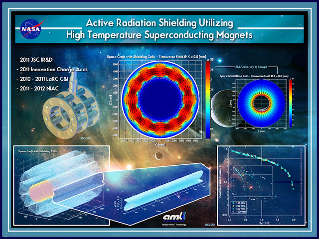 skip to main skip to sidebar Pages Home Timeslide View Flipcard March 28, 2012 Electrostatic Active Space Radiation Shielding for Deep Space Missions and Superconducting magnet radiation shields 1. Electrostatic Active Space Radiation Shielding for Deep Space Missions This study will seek to test and validate an electrostatic gossamer structure to provide radiation shielding . It will provide guidelines for energy requirements , dose reduction and deflection efficiencies , and effective enhancements of dual electrostatic-passive material shielding technologies , and engineering-feasible' architectures . Ram Tripathi , has been funded through NASA’s Innovative Advanced Concepts NIAC Program to develop an electrostatic shielding system that bends radiation particles away from . spacecraft